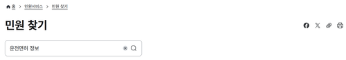 3. 민원 찾기 페이지로 이동하면 검색창이 나타납니다. 여기에 '운전면허 정보'라고 입력한 후 검색을 진행하면 관련 민원 서비스 목록을 확인할 수 있습니다.