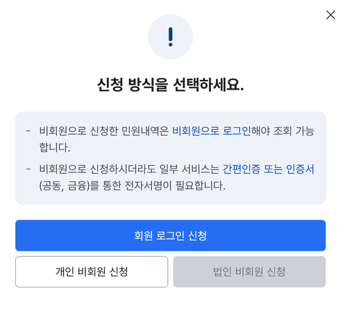 6. 조회를 위해서는 본인 인증이 필요하며, 신청 방식을 선택해야 합니다. 회원으로 로그인하여 신청하거나, 비회원 자격으로도 신청하여 정보를 확인할 수 있습니다.