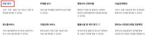2. '민원서비스' 하위 메뉴 중에서 '민원 찾기' 항목을 선택합니다. 이곳에서는 원하는 민원 업무를 키워드로 검색하여 쉽고 빠르게 찾아볼 수 있는 기능을 활용할 수 있습니다.