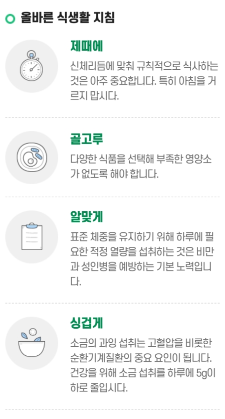 5. 건강한 상태를 유지하기 위한 올바른 식생활 지침도 찾아볼 수 있습니다. 제때에, 골고루, 알맞게, 싱겁게 먹는 습관이 건강 유지에 도움이 된다는 내용을 안내합니다.