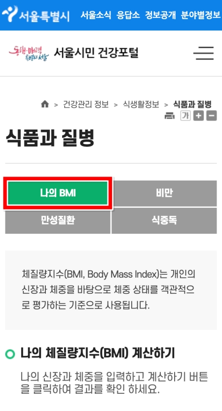 1. '식품과 질병' 항목에서 '나의 BMI'를 선택하여 신체질량지수를 확인하는 화면으로 이동합니다. 이곳에서 비만도, 만성질환 등 다른 건강 정보도 함께 살펴볼 수 있습니다.