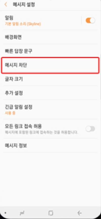 10. 메시지 설정 화면의 여러 목록 중에서 '메시지 차단' 항목을 찾아서 선택합니다. 이곳에서 번호나 문구 차단에 관한 관리를 할 수 있습니다.