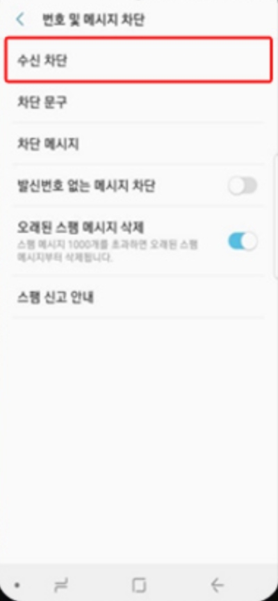 5. 번호 및 메시지 차단 메뉴 안에는 수신 차단, 차단 문구, 차단 메시지 등 세부 항목이 있습니다. 맨 위에 있는 '수신 차단'을 선택합니다.